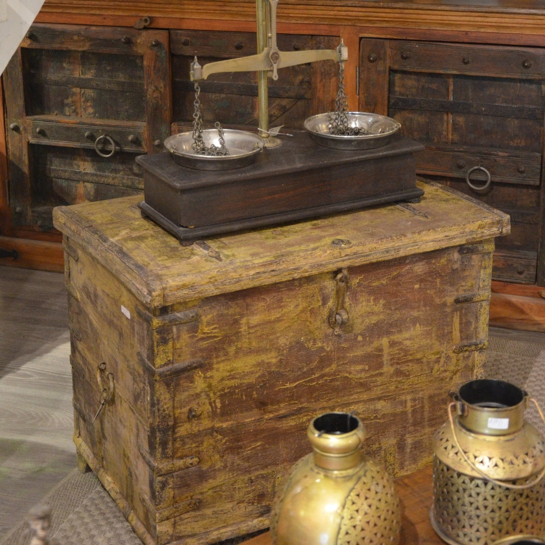 Baúl con tapa hecho de madera de teca con detalles pintados a mano en color amarillo y madera natural con acabado vintage de India.