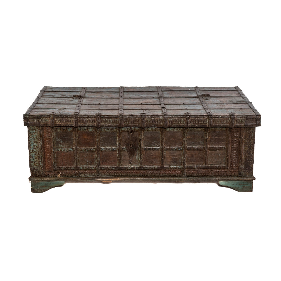 Baúl con tapa hecho de madera de teca con detalles en metal repujado de India.