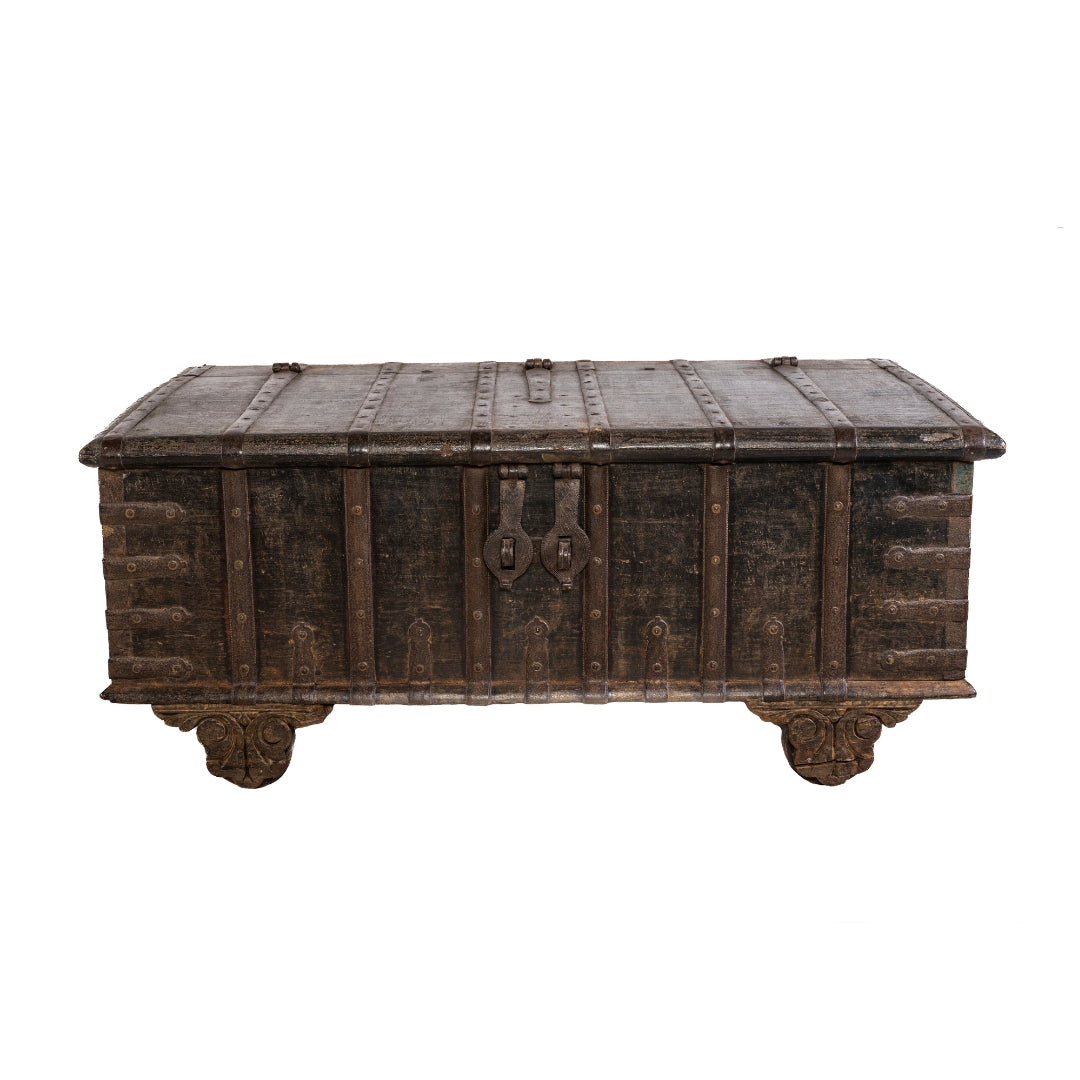 Baúl con tapa hecho de madera de teca con detalles en metal repujado y ruedas de India.