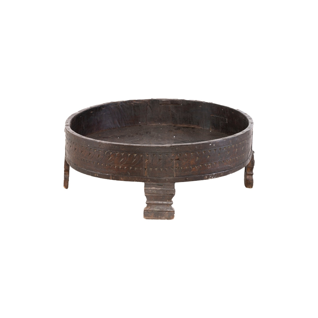 Mesa estilo batea hecha de madera de teca con detalles tallados a mano en color obscuro de India.