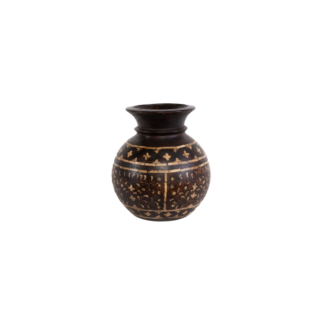 Olla o maceta redonda hecha de madera de teca con detalles incrustados a mano de hueso en tamaño chico de India.