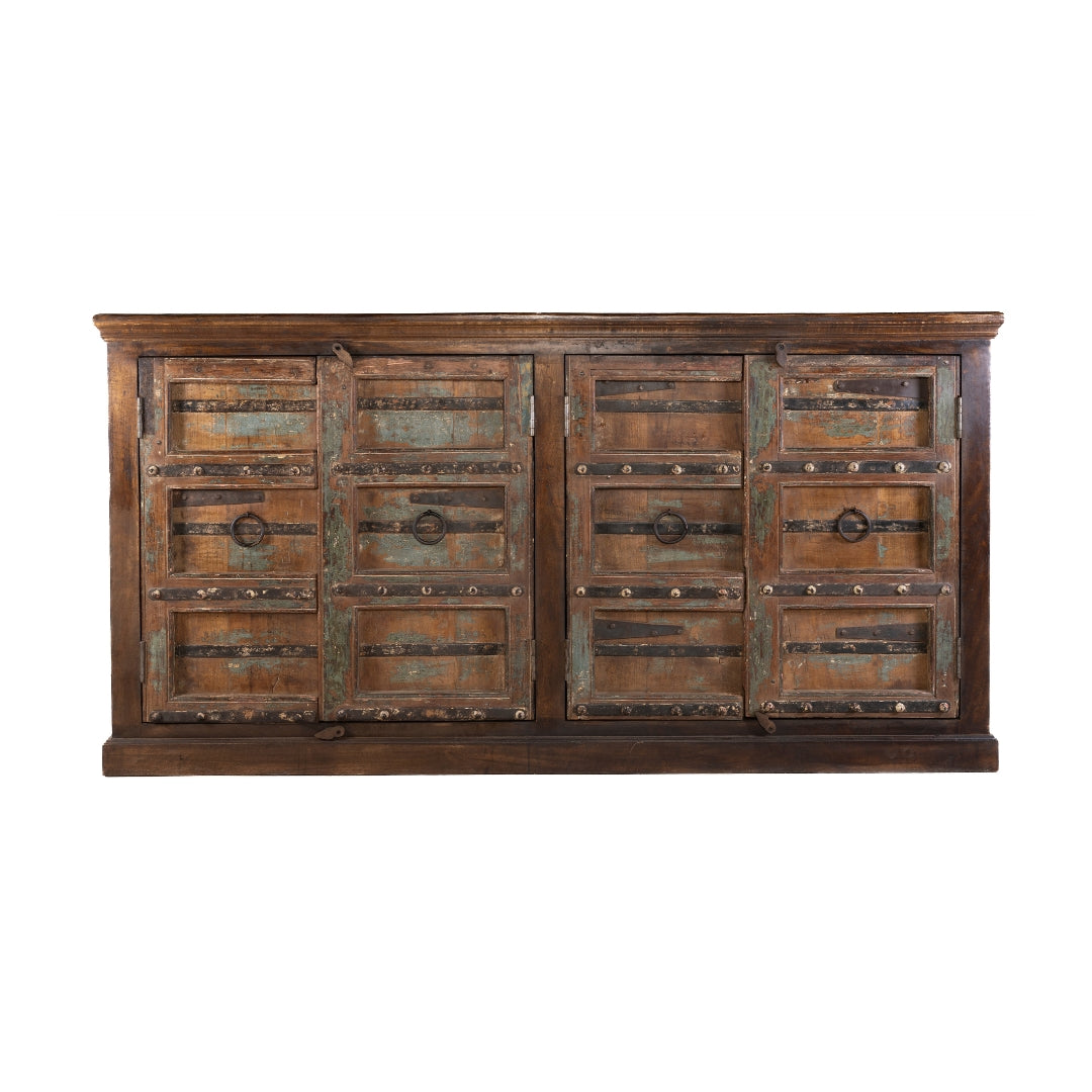 Cómoda alta con puertas antiguas hecha de madera de teca con detalles pintados a mano en acabado deslavado de India.