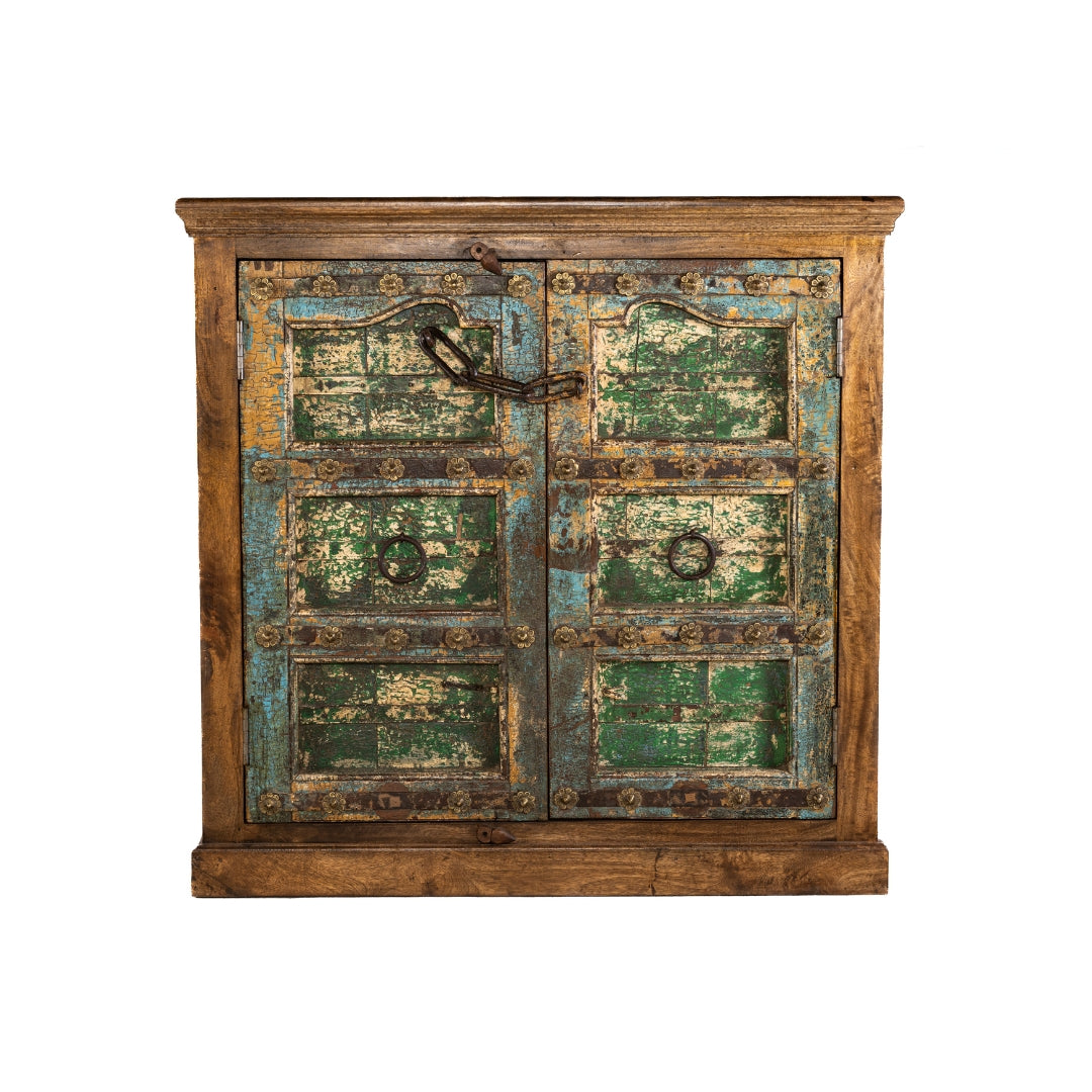 Cómoda cuadrada pequeña hecha de madera de teca con puertas antiguas hechas a mano y pintadas en varios colores con acabado deslavado de India.