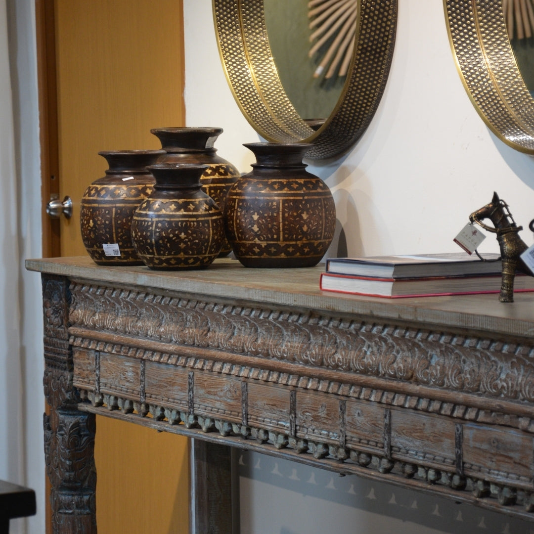 Consola larga hecha de madera de teca con detalles tallados a mano en acabado deslavado de India.