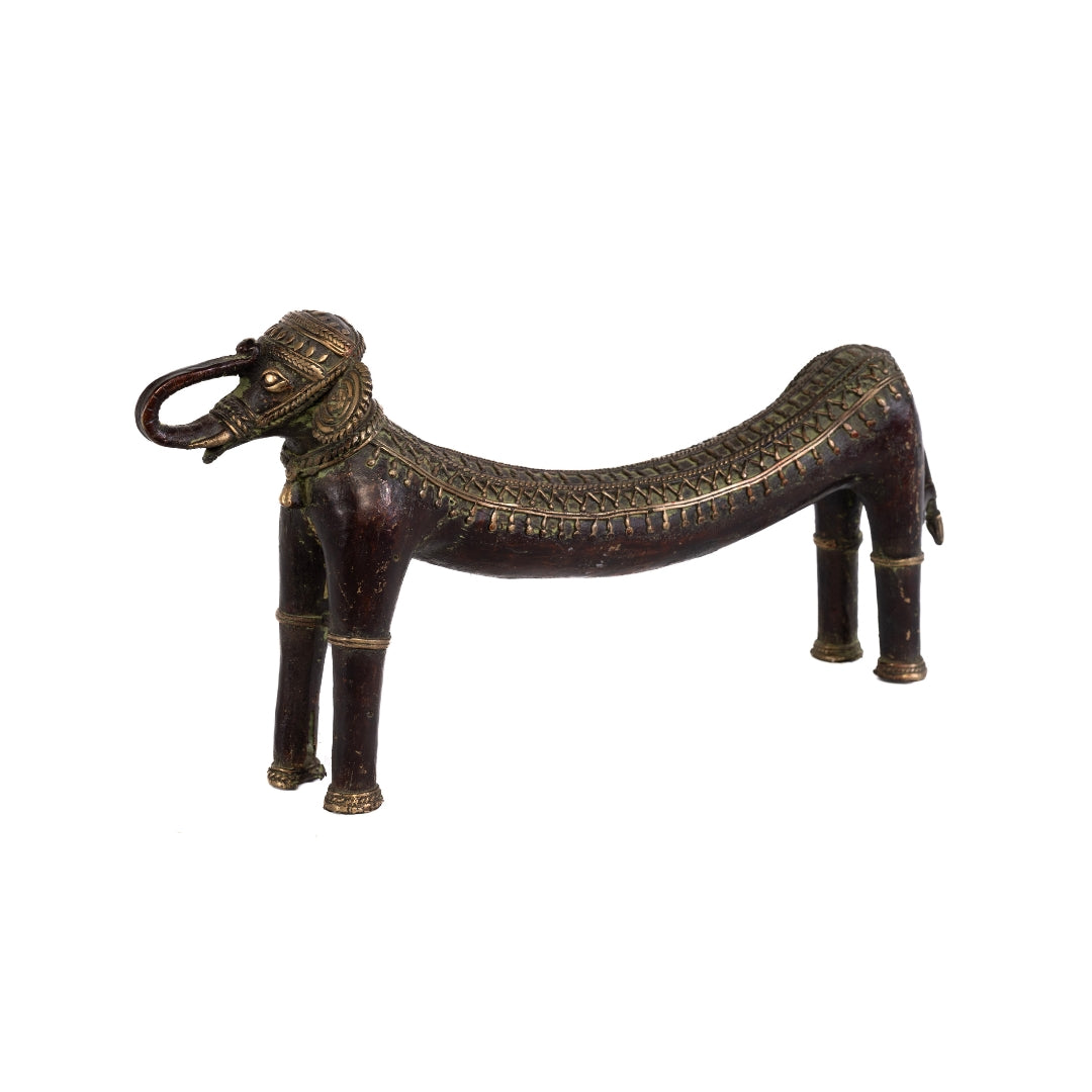 Figura antigua de elefante curveado hecho a mano de bronce en India.