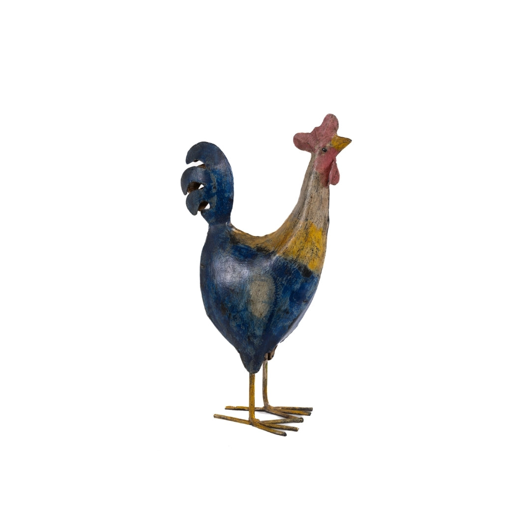 Escultura gallo de metal hecho a mano y pintado finamente con base de India.