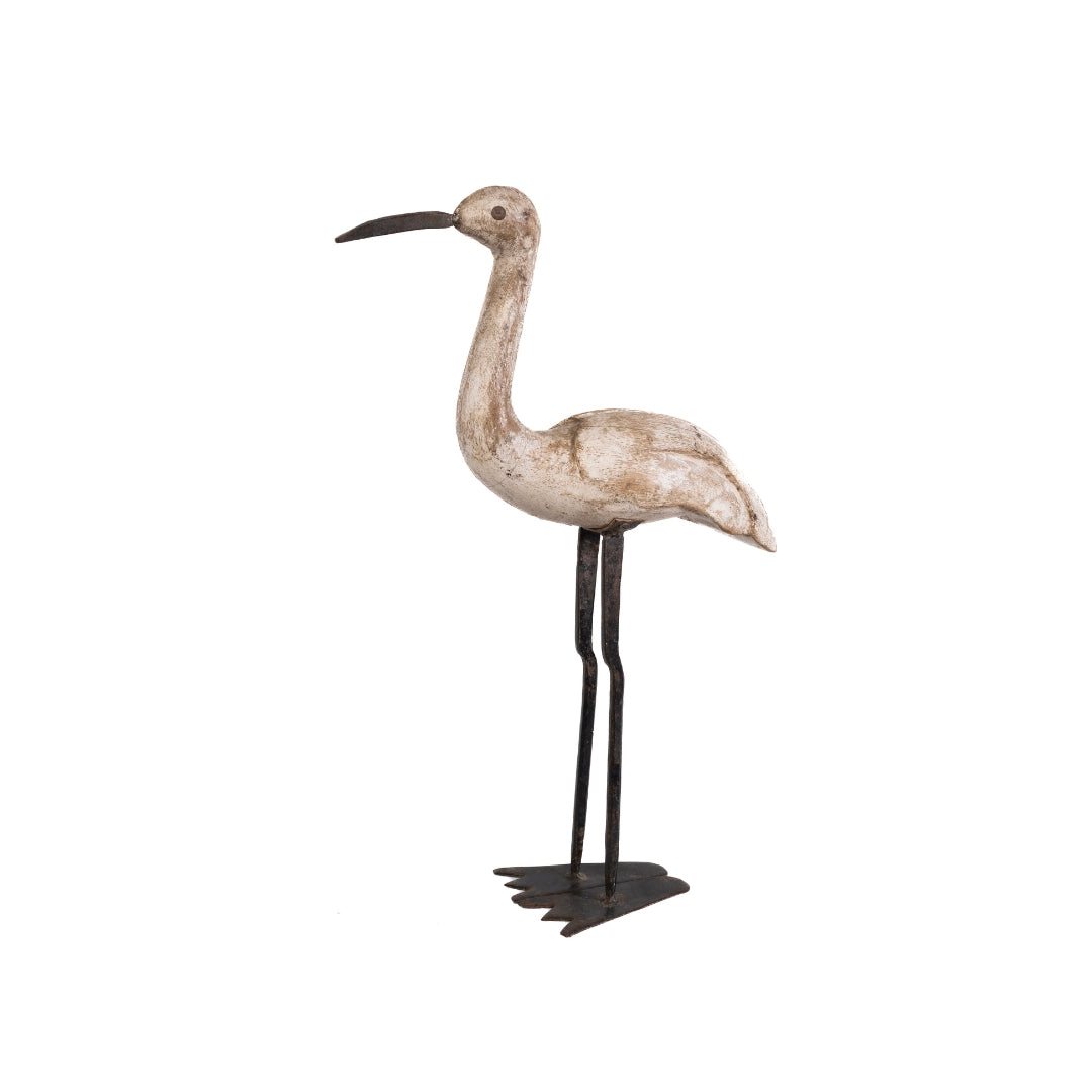 Escultura garza hecha de mano de metal y pintada a mano en color claro de India.
