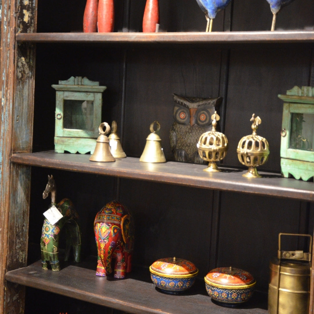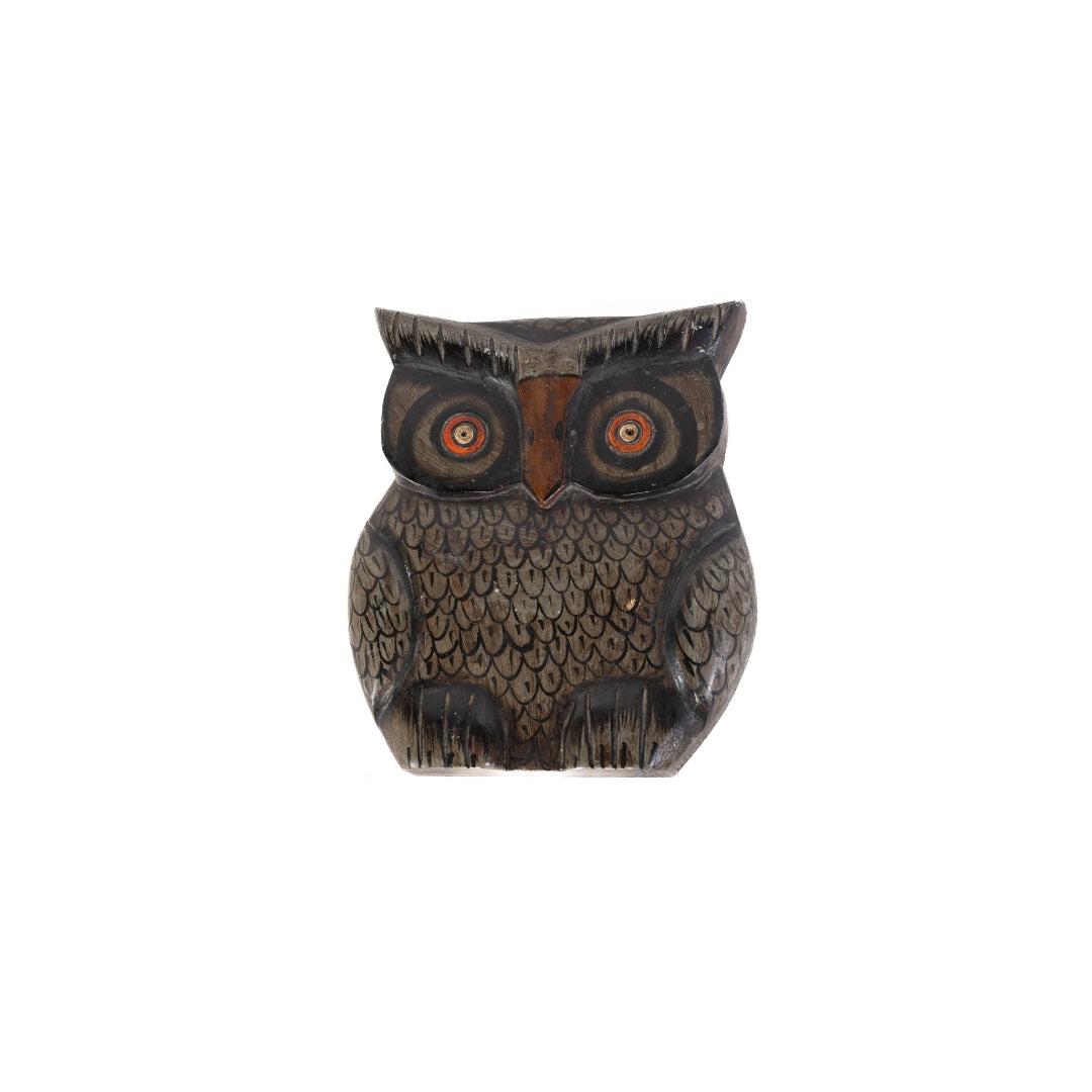 Retablo pequeño en forma de buho hecho de madera de mango y pintado a mano de India.