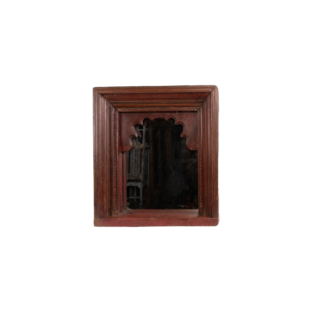 Marco cuadrado tallado a mano de madera de teca con espejo pequeño de India.