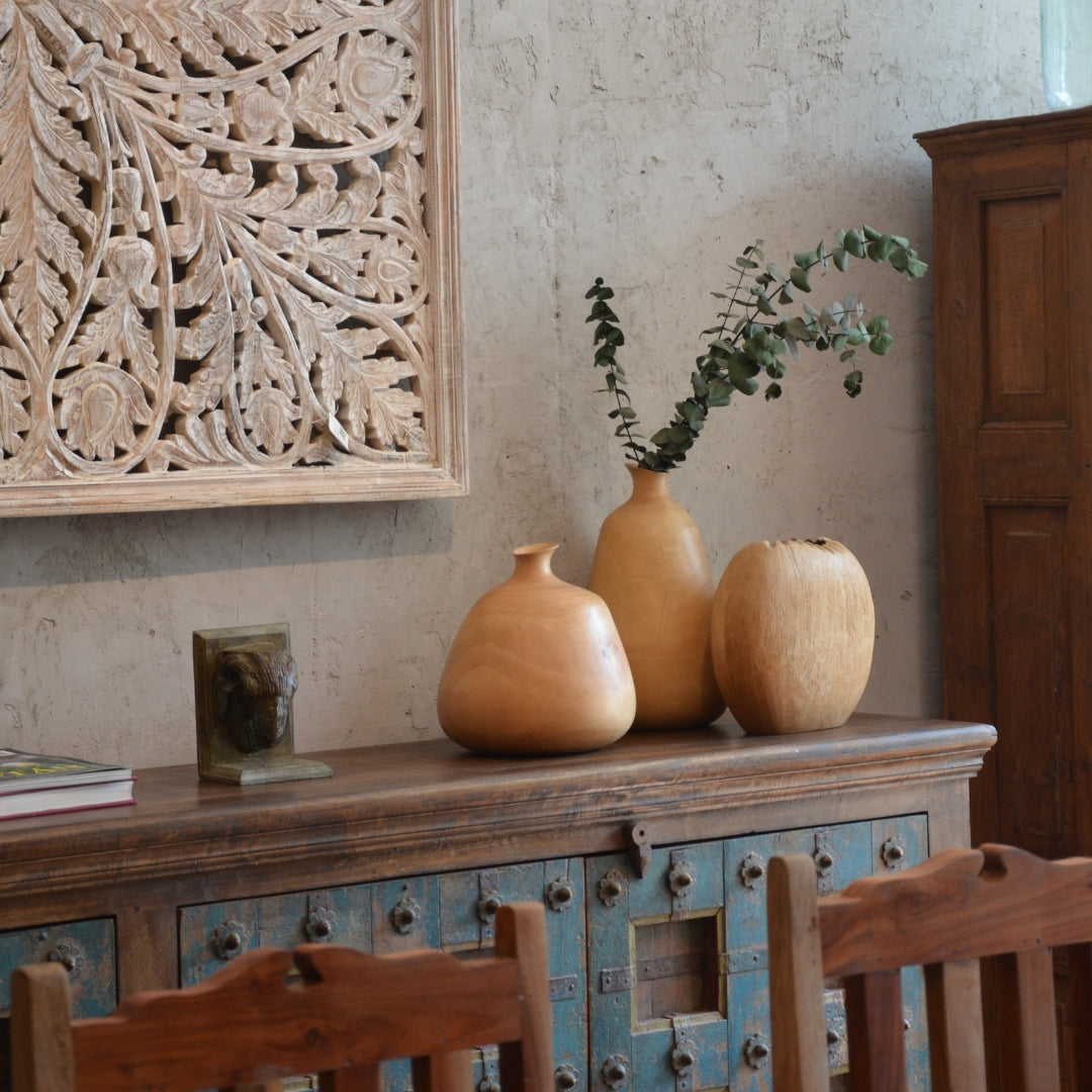 Florero hecho a mano de madera en forma de coco en color obscuro.