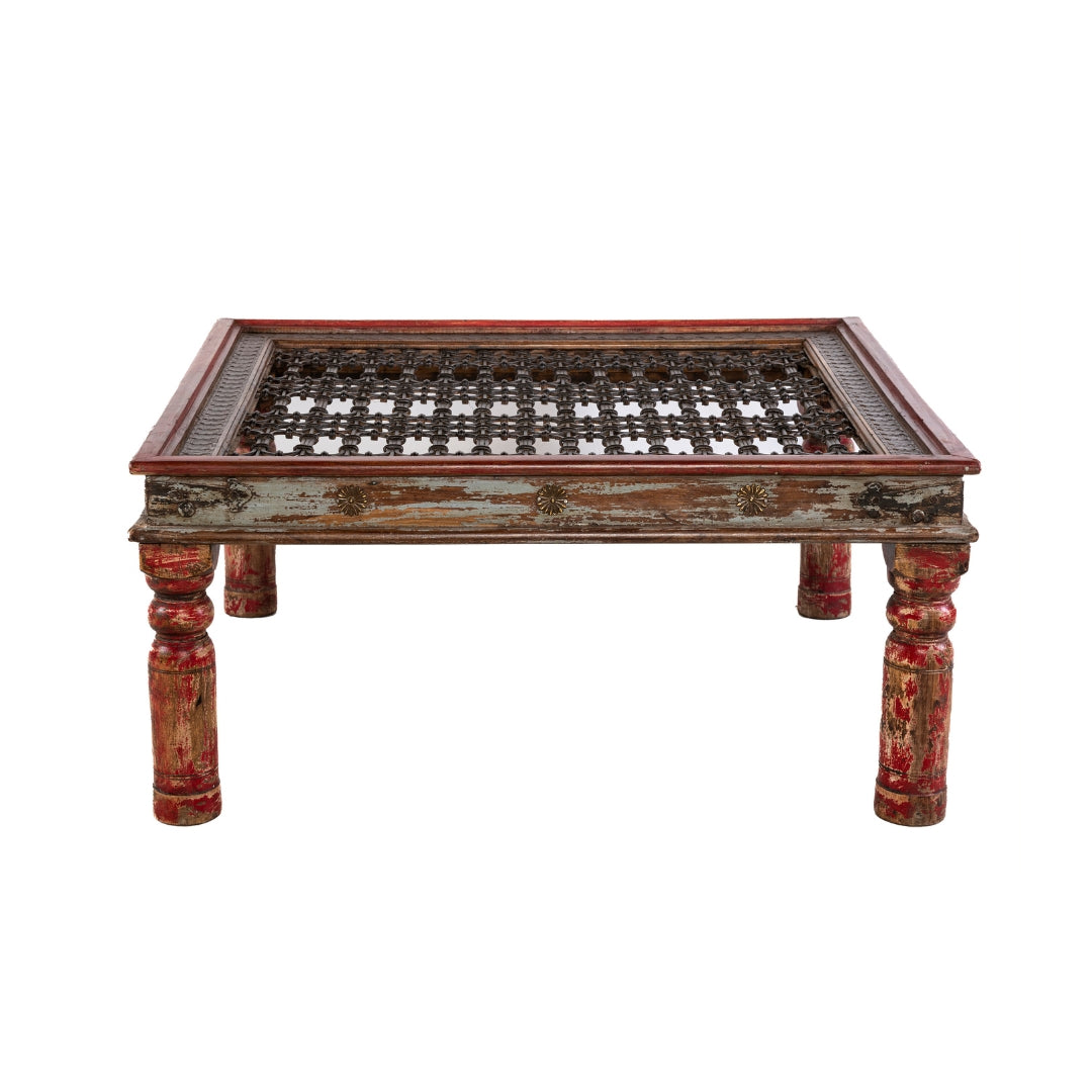 Mesa cuadrada hecha de madera de teca con rejilla de metal y detalles tallados y pintados a mano de India.