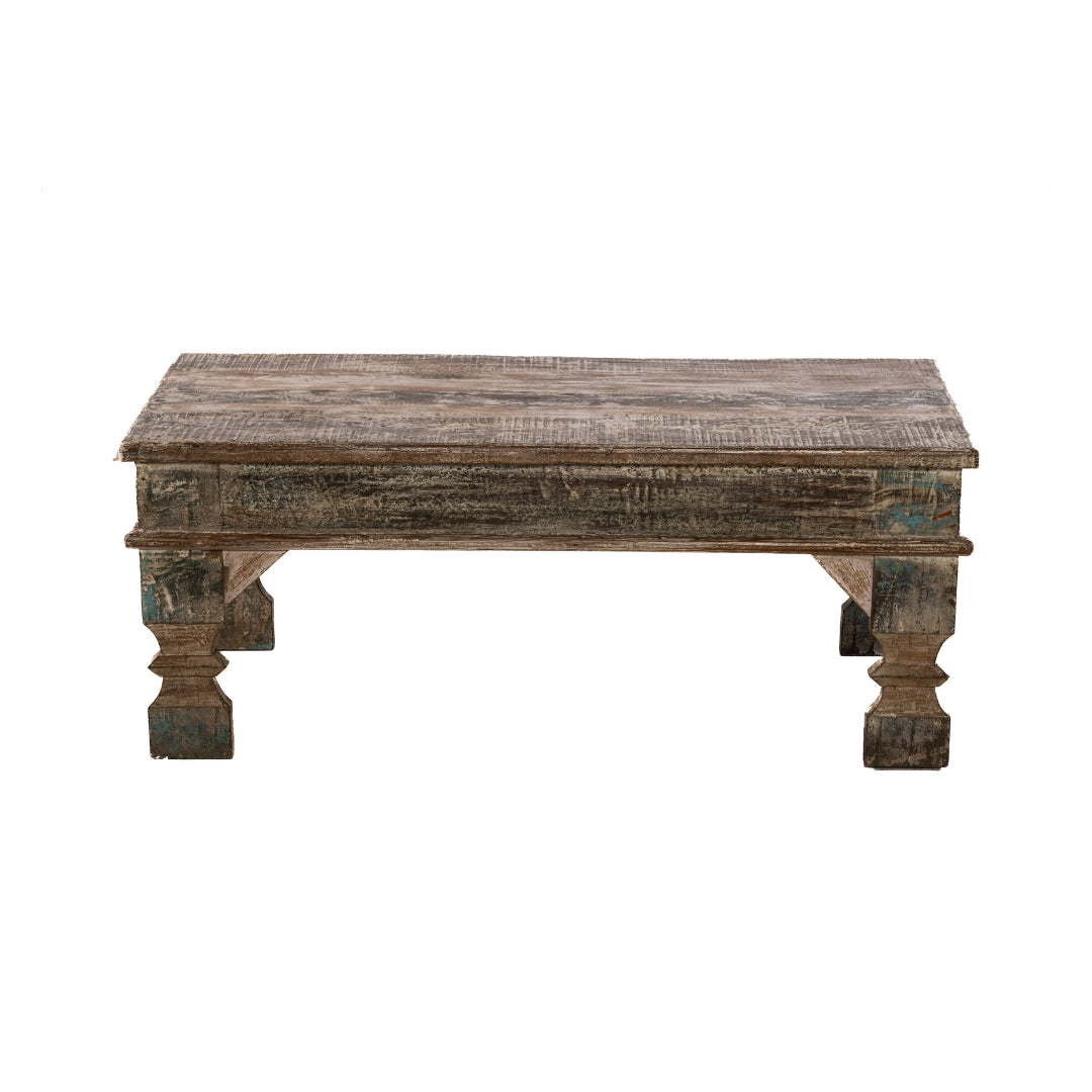 Mesa rectangular pequeña hecha de madera de teca en acabado natural de India.