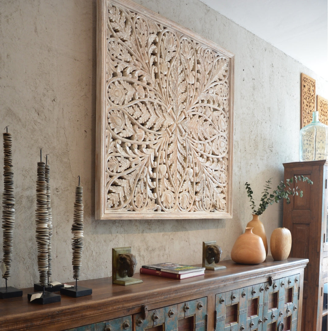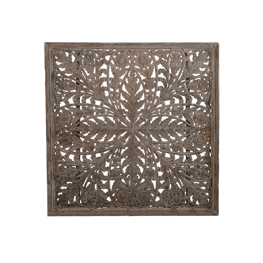 Retablo cuadrado mandala hecho de madera de soar tallado y pintado a mano de India en color claro.