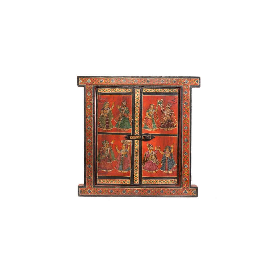Retablo ventana antigua hecha de madera de teca y pintada a mano finamente en varios colores de India.