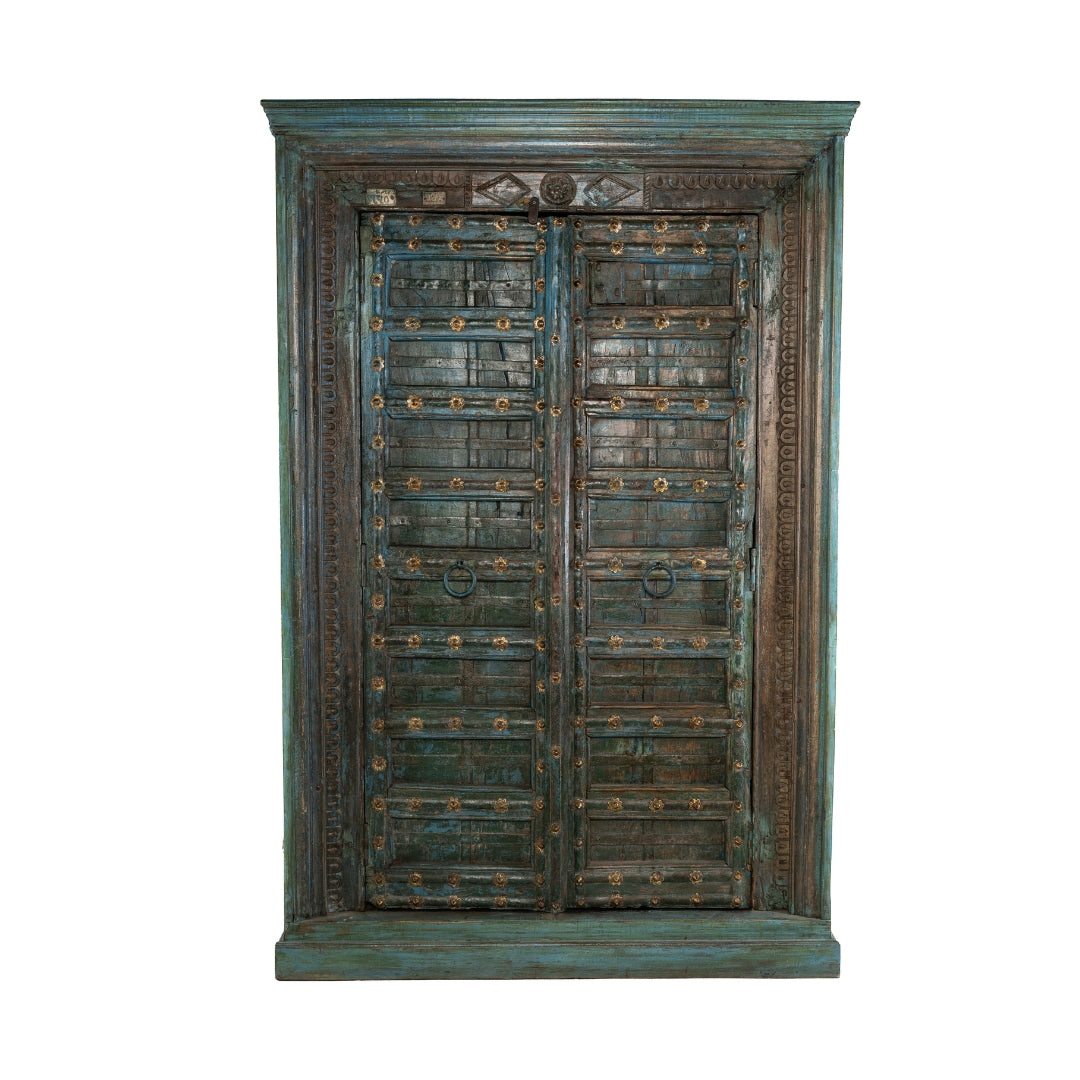 Armario hecho de madera de teca con puertas antiguas talladas a mano y pintadas en color azul de India.