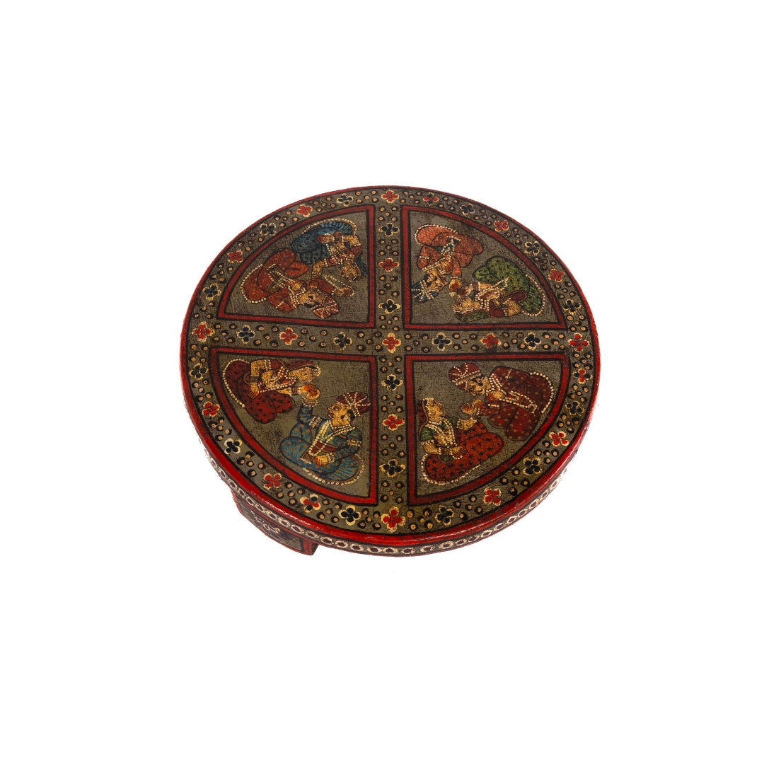 Base redonda pequeña hecha de madera de mango y pintada a mano de India.