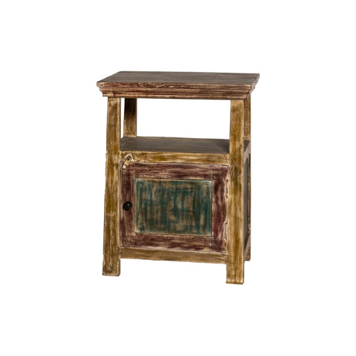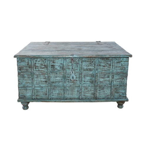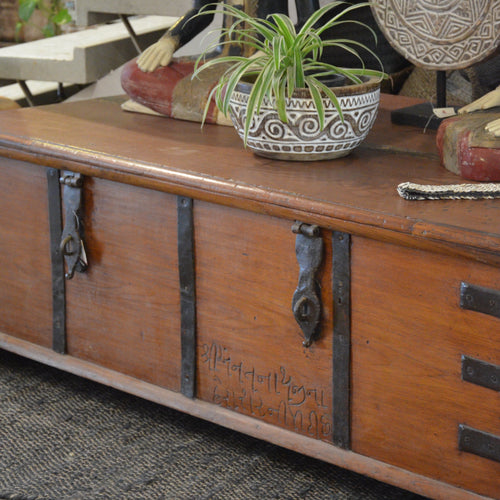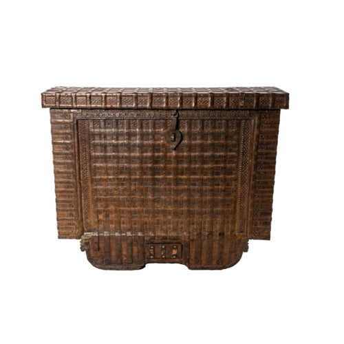 Baúl rectangular hecho de madera de teca con detalles tallados a mano y pintado en color café y acabado mate de India.