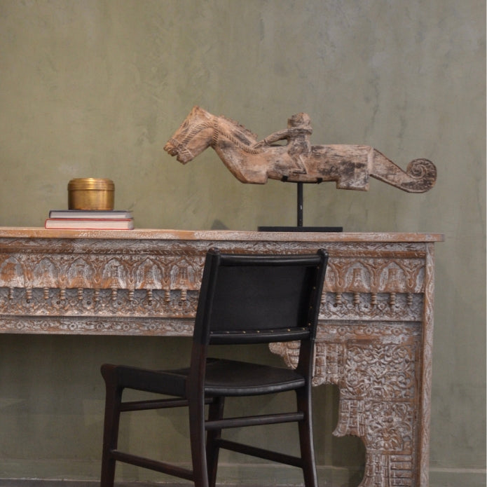 Escultura caballo con jinete hecho de madera de teca tallado a mano en tamaño chico con base de la región de Java, Indonesia.